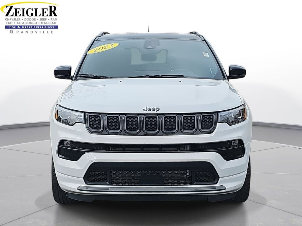 Certified. 2023 Jeep Compass High Altitude Bright White Clearcoat 10.1" Touchscreen Display, 3.73 Final Drive Ratio, 4-Wheel Disc Brakes, 4G LTE Wi-Fi Hot Spot, 6 Speakers, ABS brakes, Air Conditioning, Alexa Built-In, Alloy wheels, AM/FM radio: SiriusXM, Auto High-beam Headlights, Auto-dimming Rear-View mirror, Automatic temperature control, Body Color Door Claddings, Body Color Exterior Sill Moldings, Body Color Fascias, Body Color Wheel Flares, Brake assist, Bumpers: body-color, Cluster 10.25" TFT Color Display, Compass, Connected Travel & Traffic Services, Delay-off headlights, Disassociated Touchscreen Display, Driver door bin, Driver vanity mirror, Dual front impact airbags, Dual front side impact airbags, Electronic Stability Control, Four wheel independent suspension, Front anti-roll bar, Front Bucket Seats, Front Center Armrest w/Storage, Front dual zone A/C, Front fog lights, Front reading lights, Fully automatic headlights, Gloss Black Surround/Neutral Gray Rings, GPS Navigation, HD Radio, Heated door mirrors, Heated front seats, Heated steering wheel, Hidden Exhaust Tips-Dual, High Altitude Package, Illuminated entry, Integrated Voice Command w/Bluetooth, Knee airbag, Leather Shift Knob, Leatherette Seats, LED Low/Highbeam Projector Headlamps, Liquid Chrome/Chainmail Hydro Accent, Low tire pressure warning, Neutral Gray Exterior Accents, Neutral Gray Exterior Badging, Occupant sensing airbag, Outside temperature display, Overhead airbag, Overhead console, Panic alarm, ParkView Rear Back-Up Camera, Passenger door bin, Passenger vanity mirror, Power door mirrors, Power driver seat, Power Front/Fixed Rear Full Sunroof, Power steering, Power windows, Premium Alpine Speaker System, Premium LED Fog Lamps, Premium Taillamps, Quick Order Package 29F High Altitude, Radio: Uconnect 5 Nav w/10.1" Display, Radio: Uconnect 5 w/10.1" Display, Rain sensing wipers, Rear anti-roll bar, Rear seat center armrest, Rear window defroster, Rear window wiper, Remote keyless entry, Security system, SiriusXM Guardian - Included Trial (B), SiriusXM Radio Service, SiriusXM w/360L, Speed control, Split folding rear seat, Spoiler, Steering wheel mounted audio controls, Tachometer, Telescoping steering wheel, Tilt steering wheel, Traction control, Trip computer, Tungsten Accent Stitching, Turn signal indicator mirrors, Variably intermittent wipers, Wheels: 18" x 7" Painted Diamond Cut Aluminum, Wheels: 19" x 7.5" Aluminum Painted.