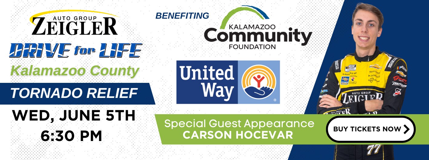KALAMAZOO, MICH (May 22, 2024) Zeigler Auto Group today announced that it will be hosting the Drive for Kalamazoo County Tornado Relief fundraiser headlined by Portage native and NASCAR driver Carson Hocevar in benefit of the Kalamazoo Community Foundation in partnership with United Way. The event, presented by the Zeigler's Drive for Life Foundation and Spire Motorsports, will take place on Wednesday, June 5, 2024 at Zeigler Motorsports (5001 Park Circle Drive).