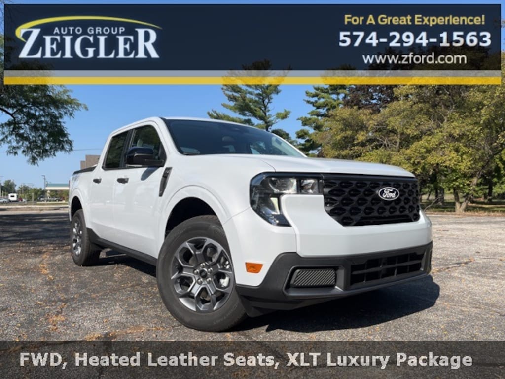 White Metallic 2025 Ford Maverick XLT LEATHER, PUSH BUTTON START, REAR VIEW CAMERA, REVERSE SENSING SYSTEM, SYNC, HEATED SEATS, BLUETOOTH, 2.5L I-4 Hybrid, 400W Inverter w/USB Console Rear, Auto High Beams, BLIS w/Cross-Traffic Alert, Cross Traffic Brake Assist, Equipment Group 300A, Evasive Steering Assist, Ford Co-Pilot360 1.0, Heated Mirror w/Painted Black Skull Caps, Heated Seats, Intersection Assist, Lane-Keeping System, LED Box Lighting, Power Glass Manual-Folding Mirrors, Pre-Collision Assist w/Automatic Emergency Braking, Rear Parking Sensors, Rear-View Camera, Remote Start System, Soft Vinyl Wrapped Heated Steering Wheel, XLT Luxury Package.