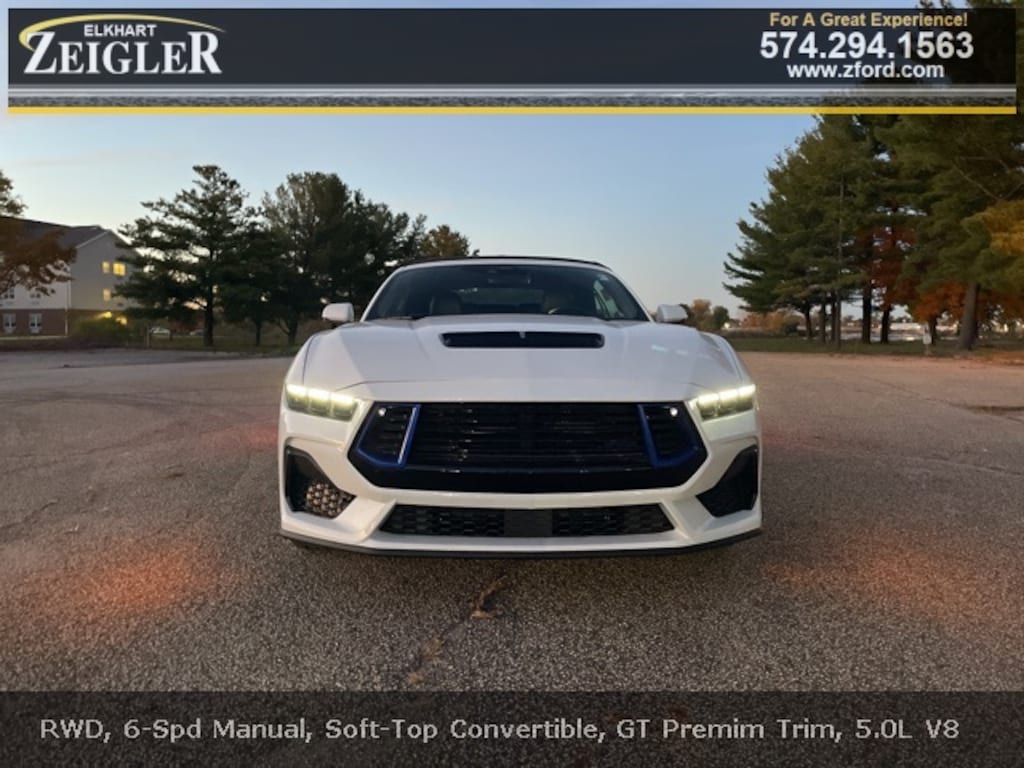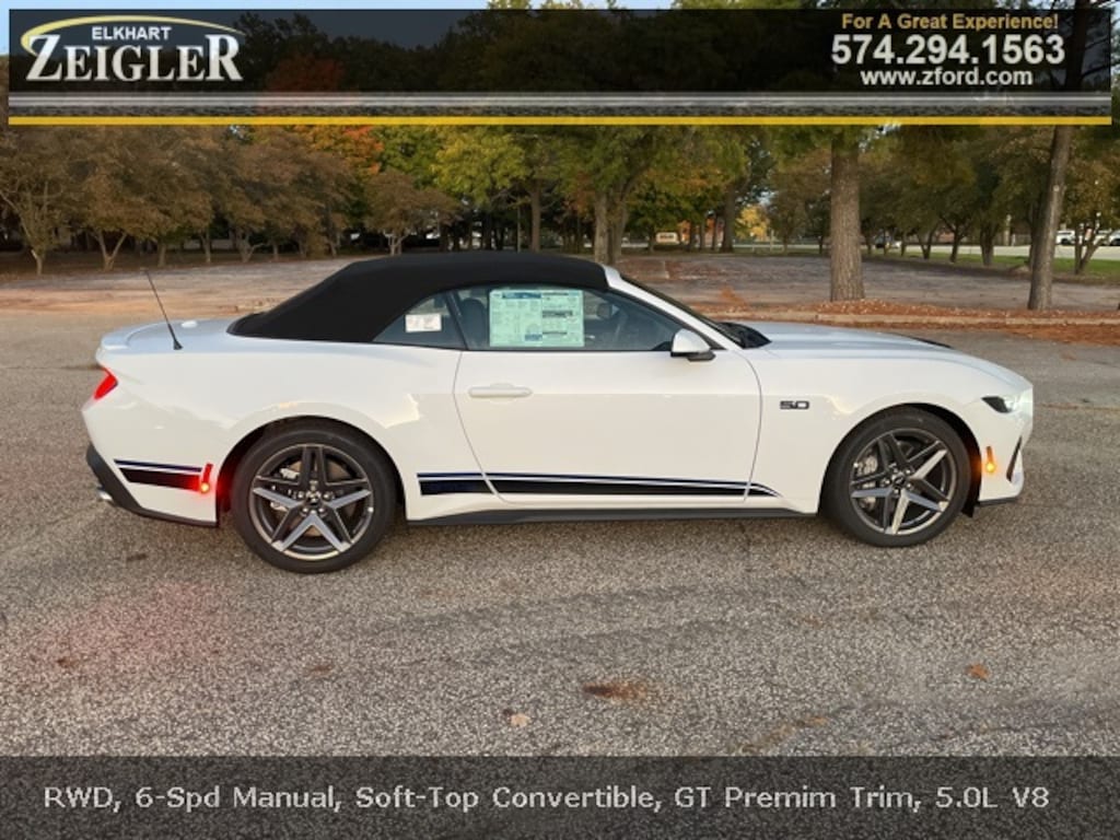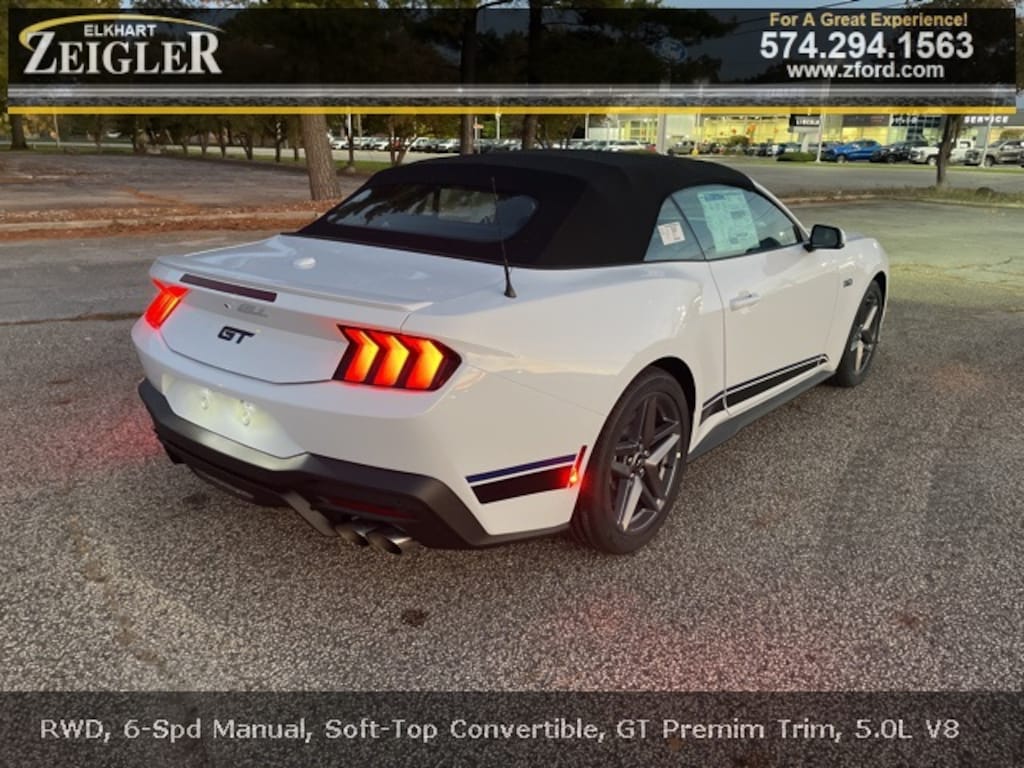 Oxford White 2025 Ford Mustang GT Premium California Special Package LEATHER, NAVIGATION, PUSH BUTTON START, REAR VIEW CAMERA, REVERSE SENSING SYSTEM, SYNC, HEATED SEATS, RWD, Mustang GT Premium California Special Package, 2D Convertible, 5.0L V8 Ti-VCT, 6-Speed Manual, RWD, Trimmed Seats Navy Pier Leather, Active Anti-Theft System, Black Burkeshire w/Accent Stitching Floor Mats, Black Onyx w/Accent Stitching Door Trim Panels, Black Side Stripe, California Special Package, Connected Navigation, Driver Seat & Mirrors Memory, Equipment Group 401A High Package, Ford Co-Pilot360 Assist+, Headlamps w/Black Bezels, Illuminated Door-Sill Scuff Plates, Integrated Turn Signals, Leather-Trimmed Bucket Seats, Leather-Trimmed Bucket Seats w/Color Accents, Locking Center Console, Painted High Gloss Black Horizontal Bars Grille, Pre-Collision Assist w/Automatic Emergency Braking, Rave Blue Side Stripe, Security Package, Wheel Locking Kit.