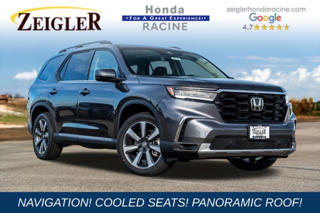 Modern Steel Metallic AWD ++, NAVIGATION, HEADS UP DISPLAY, APPLE CARPLAY, ANDROID AUTO, BLIND SPOT MONITOR, REMOTE START, WIRELESS PHONE CHARGER, ADAPTIVE CRUISE CONTROL, LANE DEPARTURE WARNING, PANORAMIC ROOF, PARKING SENSORS, POWER LIFTGATE, LEATHER INTERIOR, HEATED STEERING WHEEL, HEATED SEATS, COOLED SEATS, HEATED REAR SEATS, MEMORY SEATS, 3RD ROW SEATING, BOSE AUDIO, BACKUP CAMERA, KEYLESS ENTRY, BLUETOOTH, 12 Speakers, 3rd row seats: split-bench, 4-Wheel Disc Brakes, 4.167 Axle Ratio, ABS brakes, Adaptive Cruise Control: Adaptive Cruise Control (ACC) with Low-Speed Follow, Air Conditioning, All Season Mat (PPO), AM/FM radio: SiriusXM, Apple CarPlay/Android Auto, Auto High-beam Headlights, Auto-dimming door mirrors, Auto-dimming Rear-View mirror, Automatic temperature control, Blind Spot Information (BSI) System warning, Bose Premium Sound System, Brake assist, Bumpers: body-color, Cargo Cover, Compass, Delay-off headlights, Door Sill Film (PPO), Driver door bin, Driver vanity mirror, Dual front impact airbags, Dual front side impact airbags, Electronic Stability Control, Emergency communication system: HondaLink, Exterior Parking Camera Rear, Four wheel independent suspension, Four Wheels, Front anti-roll bar, Front Bucket Seats, Front Center Armrest, Front dual zone A/C, Front fog lights, Front reading lights, Fully automatic headlights, Function Package (PPO), Garage door transmitter: HomeLink, Heads-Up Display, Heated & Ventilated Front Bucket Seats, Heated door mirrors, Heated front seats, Heated rear seats, Heated steering wheel, Honda Satellite-Linked Navigation System, HondaLink Subscription Services, Illuminated entry, Knee airbag, Lane departure: Lane Keeping Assist System (LKAS) active, Low tire pressure warning, Memory seat, Navigation system: Honda Satellite-Linked Navigation System, Occupant sensing airbag, Outside temperature display, Overhead airbag, Overhead console, Panic alarm, Passenger door bin, Passenger vanity mirror, Perforated Leather Seat Trim, Power door mirrors, Power driver seat, Power Liftgate, Power moonroof, Power passenger seat, Power steering, Power windows, Radio data system, Rain sensing wipers, Rear air conditioning, Rear anti-roll bar, Rear Bumper Applique, Rear reading lights, Rear seat center armrest, Rear window defroster, Rear window wiper, Reclining 3rd row seat, Remote keyless entry, Security system, SiriusXM, Speed control, Speed-sensing steering, Speed-Sensitive Wipers, Split folding rear seat, Spoiler, Steering wheel mounted audio controls, Tachometer, Telescoping steering wheel, Tilt steering wheel, Traction control, Trip computer, Turn signal indicator mirrors, Variably intermittent wipers, Ventilated front seats, Wheels: 20" Shark Gray Machine Face w/Blk Lug Nuts. 2025 Honda Pilot Elite AWD 10-Speed Automatic At Zeigler Honda of Racine, we take pride in treating our customers like family, ensuring that your experience is one that you will never forget.Take advantage of our VIP test drive and experience by calling us at (262) 822-3231. We are proud to service customers in Racine, Mt. Pleasant, Milwaukee, Kenosha, and surrounding areas! See dealer for complete details, price may exclude certification, added accessories and/or packages, certain taxes, $399 doc fee, charges and/or fees. Dealer is not responsible for pricing errors. Book values should be considered estimates only. Some of our used vehicles may be subject to unrepaired safety recalls.