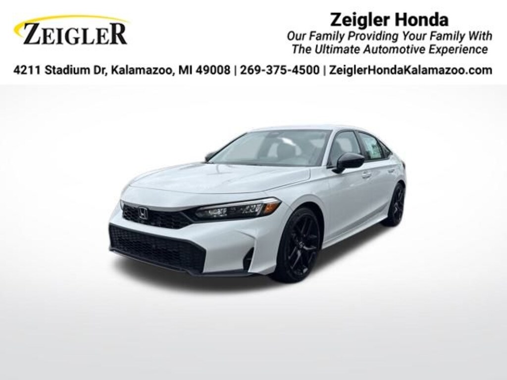Recent Arrival! 2026 Civic Honda Sport Platinum White Pearl Black w/Cloth/Leatherette Seating Surfaces, Adaptive Cruise Control: Adaptive Cruise Control (ACC) with Low-Speed Follow, Apple CarPlay/Android Auto, Blind Spot Information (BSI) System warning, Emergency communication system: HondaLink, Heated door mirrors, Illuminated entry, Power door mirrors, Remote keyless entry, Steering wheel mounted audio controls, Traction control.