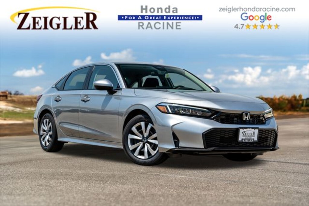 32/41 City/Highway MPG Silver 2026 Honda Civic LX FWD CVT At Zeigler Honda of Racine, we take pride in treating our customers like family, ensuring that your experience is one that you will never forget.Take advantage of our VIP test drive and experience by calling us at (262) 822-3231. We are proud to service customers in Racine, Mt. Pleasant, Milwaukee, Kenosha, and surrounding areas! See dealer for complete details, price may exclude certification, added accessories and/or packages, certain taxes, $399 doc fee, charges and/or fees. Dealer is not responsible for pricing errors. Book values should be considered estimates only. Some of our used vehicles may be subject to unrepaired safety recalls.