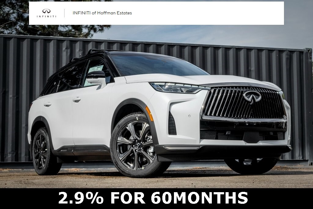Our Family, serving your Family the ultimate automotive experience. We are conveniently located at 1075 W Golf Road in Hoffman Estates, IL. You can also reach INFINITI of Hoffman Estates any time by filling out our contact form or calling us. The entire staff at INFINITI of Hoffman Estates looks forward to serving you! Online price does not include sales tax, title, doc, or registration. Please call for availability. The vehicle may show on the website and not be in stock . 224-653-2901. Dark Cargo Package (Black Rear Bumper Film, Cargo Blocks, Cargo Mat, Cargo Net, and Medic Kit), 2-Tone Super Premium Paint, 20 Speakers, 3rd row seats: bench, 4-Wheel Disc Brakes, ABS brakes, Air Conditioning, Alloy wheels, AM/FM radio: SiriusXM with 360L, Anti-whiplash front head restraints, Apple CarPlay/Android Auto, Auto High-beam Headlights, Auto tilt-away steering wheel, Auto-dimming door mirrors, Auto-dimming Rear-View mirror, Automatic temperature control, Black Roof Rail Crossbars, Bose Performance Series 17-Speaker Sound System, Brake assist, Bumpers: body-color, Climate Controlled Massaging Front Bucket Seats, Delay-off headlights, Driver door bin, Driver vanity mirror, Dual front impact airbags, Dual front side impact airbags, Electronic Stability Control, Emergency communication system: INFINITI InTouch, Four wheel independent suspension, Front anti-roll bar, Front Bucket Seats, Front Center Armrest, Front dual zone A/C, Front reading lights, Fully automatic headlights, Garage door transmitter: HomeLink, Genuine wood door panel insert, Heads-Up Display, Heated door mirrors, Heated front seats, Heated rear seats, Heated steering wheel, Illuminated entry, INFINITI Radiant Dark Illum Cargo Scuff Plates, Knee airbag, Leather Shift Knob, Leather steering wheel, Low tire pressure warning, Memory seat, Navigation system: Google Built-in, Occupant sensing airbag, Outside temperature display, Overhead airbag, Overhead console, Panic alarm, Passenger door bin, Passenger vanity mirror, Power door mirrors, Power driver seat, Power Liftgate, Power moonroof: Panoramic, Power passenger seat, Power steering, Power windows, Radio data system, Radio: Klipsch Reference Premiere Audio System, Rain sensing wipers, Rear air conditioning, Rear anti-roll bar, Rear reading lights, Rear side impact airbag, Rear window defroster, Rear window wiper, Reclining 3rd row seat, Remote keyless entry, Security system, Semi Aniline Leather-Appointed Seating Surfaces, Speed control, Speed-sensing steering, Speed-Sensitive Wipers, Splash Guards, Split folding rear seat, Spoiler, Steering wheel memory, Steering wheel mounted audio controls, Tachometer, Telescoping steering wheel, Tilt steering wheel, Traction control, Trip computer, Turn signal indicator mirrors, Variably intermittent wipers, Ventilated front seats, and Wheels: 20" x 8J Luxury Machined Aluminum Alloy.