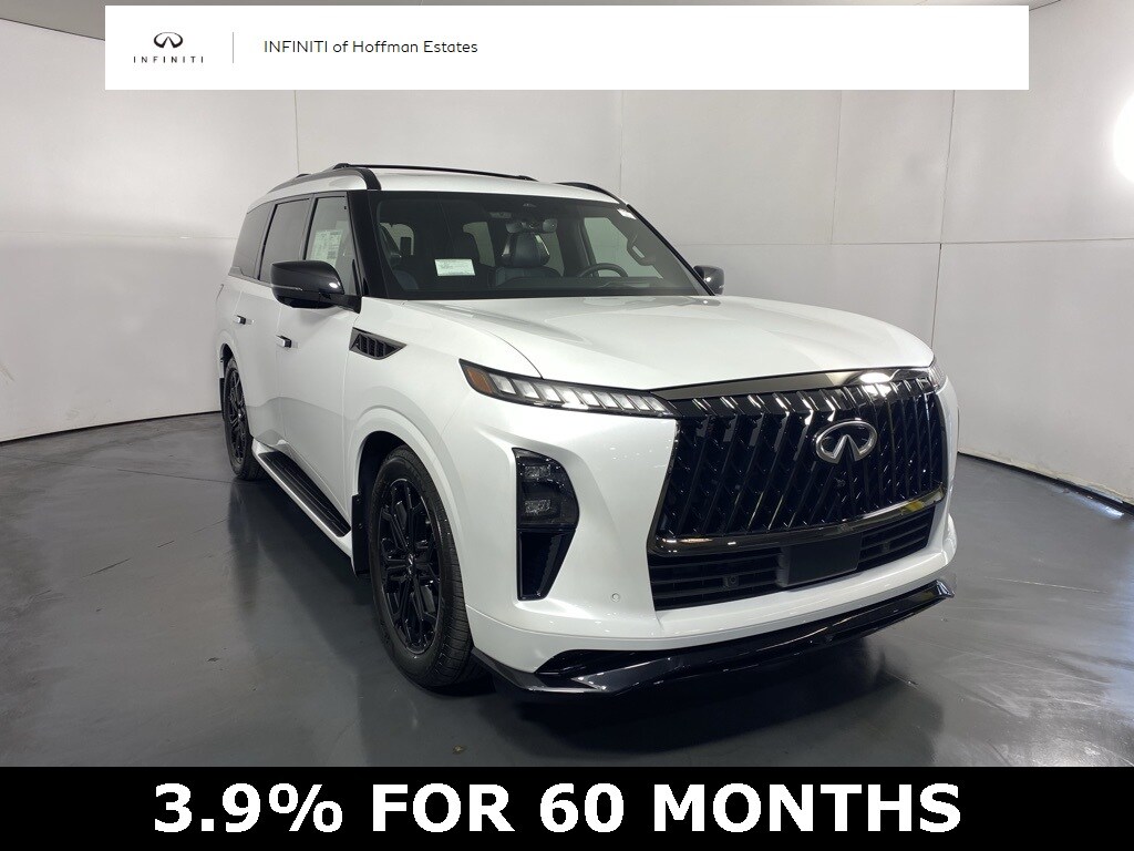 Our Family, serving your Family the ultimate automotive experience. We are conveniently located at 1075 W Golf Road in Hoffman Estates, IL. You can also reach INFINITI of Hoffman Estates any time by filling out our contact form or calling us. The entire staff at INFINITI of Hoffman Estates looks forward to serving you! Online price does not include sales tax, title, doc, or registration. Please call for availability. The vehicle may show on the website and not be in stock . 224-653-2901. ABS brakes, Alloy wheels, Compass, Electronic Stability Control, Front dual zone A/C, Heated door mirrors, Heated front seats, Heated rear seats, Illuminated entry, Low tire pressure warning, Power Liftgate, Power moonroof, Remote keyless entry, Traction control, 3rd row seats: bench, 4-Wheel Disc Brakes, Adaptive suspension, Air Conditioning, AM/FM radio: SiriusXM with 360L, Anti-whiplash front head restraints, Apple CarPlay/Android Auto, Audio memory, Auto High-beam Headlights, Auto tilt-away steering wheel, Auto-dimming door mirrors, Auto-dimming Rear-View mirror, Auto-leveling suspension, Automatic temperature control, Brake assist, Delay-off headlights, Driver door bin, Driver vanity mirror, Dual front impact airbags, Dual front side impact airbags, Emergency communication system: INFINITI InTouch, Four wheel independent suspension, Front anti-roll bar, Front Bucket Seats, Front Center Armrest, Front reading lights, Fully automatic headlights, Genuine wood dashboard insert, Genuine wood door panel insert, Heads-Up Display, Heated steering wheel, Htd & Climate Controlled Fr Bucket Seats w/Massage, HVAC memory, Knee airbag, Leather steering wheel, Memory seat, Navigation system: Google Built-in, Occupant sensing airbag, Outside temperature display, Overhead airbag, Overhead console, Panic alarm, Passenger door bin, Passenger vanity mirror, Power door mirrors, Power driver seat, Power passenger seat, Power steering, Power windows, Radio data system, Radio: Klipsch Reference Premiere Audio System, Rain sensing wipers, Rear air conditioning, Rear anti-roll bar, Rear reading lights, Rear seat center armrest, Rear window defroster, Rear window wiper, Reclining 3rd row seat, Security system, Speed control, Speed-sensing steering, Split folding rear seat, Spoiler, Steering wheel memory, Steering wheel mounted audio controls, Tachometer, Telescoping steering wheel, Tilt steering wheel, Trip computer, Turn signal indicator mirrors, Variably intermittent wipers, Ventilated front seats, and Ventilated rear seats.