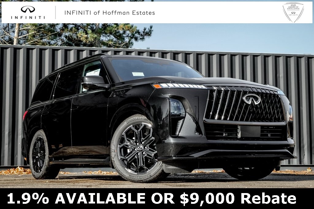 Our Family, serving your Family the ultimate automotive experience. We are conveniently located at 1075 W Golf Road in Hoffman Estates, IL. You can also reach INFINITI of Hoffman Estates any time by filling out our contact form or calling us. The entire staff at INFINITI of Hoffman Estates looks forward to serving you! Online price does not include sales tax, title, doc, or registration. Please call for availability. The vehicle may show on the website and not be in stock . 224-653-2901. 3rd row seats: bench, 4-Wheel Disc Brakes, ABS brakes, Adaptive suspension, Air Conditioning, Alloy wheels, AM/FM radio: SiriusXM with 360L, Anti-whiplash front head restraints, Apple CarPlay/Android Auto, Audio memory, Auto High-beam Headlights, Auto tilt-away steering wheel, Auto-dimming door mirrors, Auto-dimming Rear-View mirror, Auto-leveling suspension, Automatic temperature control, Black Roof Rail Crossbars, Brake assist, Compass, Dark Chrome Rear Bumper Protector, Delay-off headlights, Driver door bin, Driver vanity mirror, Dual front impact airbags, Dual front side impact airbags, Electronic Stability Control, Emergency communication system: INFINITI InTouch, Four wheel independent suspension, Front anti-roll bar, Front Bucket Seats, Front Center Armrest, Front dual zone A/C, Front reading lights, Fully automatic headlights, Garage door transmitter: HomeLink, Genuine wood dashboard insert, Genuine wood door panel insert, Heads-Up Display, Heated door mirrors, Heated front seats, Heated rear seats, Heated steering wheel, HVAC memory, Illuminated entry, Knee airbag, Leather steering wheel, Low tire pressure warning, Memory seat, Navigation system: Google Built-in, Occupant sensing airbag, Outside temperature display, Overhead airbag, Overhead console, Panic alarm, Passenger door bin, Passenger vanity mirror, Power door mirrors, Power driver seat, Power Liftgate, Power moonroof, Power passenger seat, Power steering, Power windows, Radio data system, Rain sensing wipers, Rear air conditioning, Rear anti-roll bar, Rear reading lights, Rear seat center armrest, Rear window defroster, Rear window wiper, Reclining 3rd row seat, Remote keyless entry, Security system, Speed control, Speed-sensing steering, Splash Guards, Split folding rear seat, Spoiler, Steering wheel memory, Steering wheel mounted audio controls, Tachometer, Telescoping steering wheel, Tilt steering wheel, Traction control, Trip computer, Turn signal indicator mirrors, Unique SPORT Semi-Aniline Leather Seating Surfaces, Variably intermittent wipers, Ventilated front seats, Ventilated rear seats, and Wheels: 22" x 8.5J Unique SPORT Alloy.