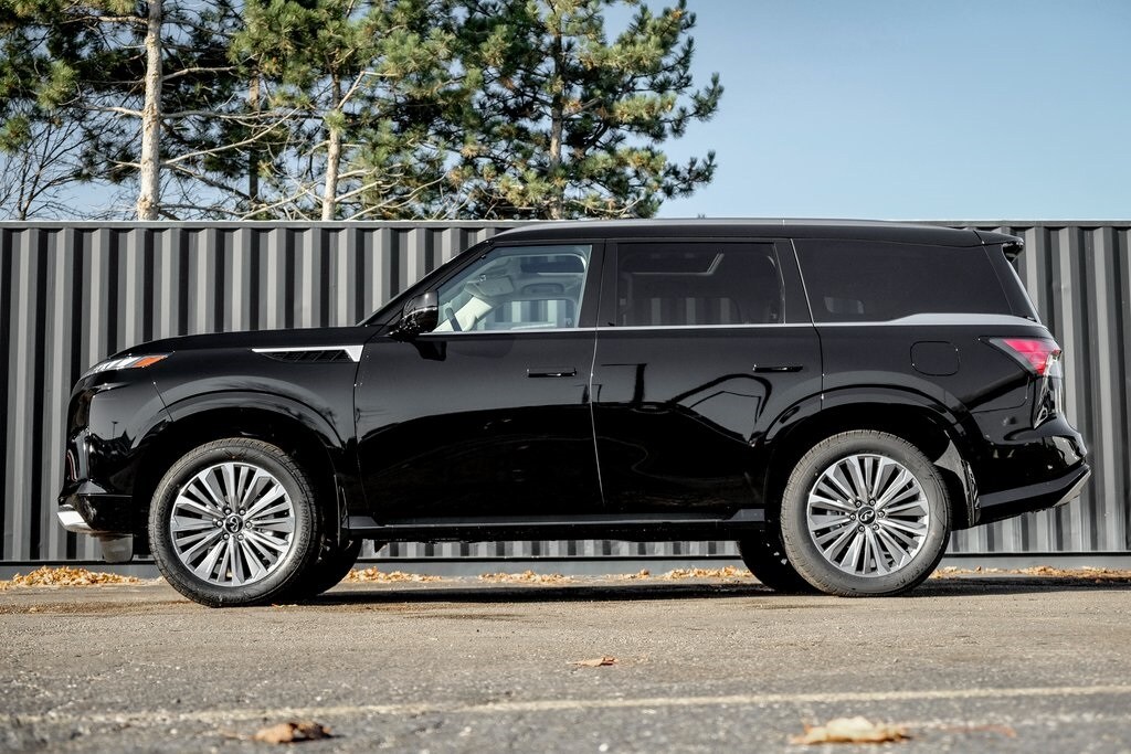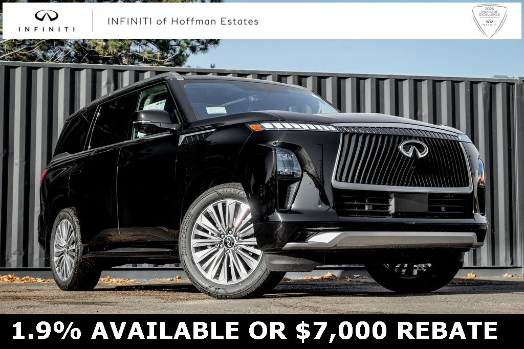 Our Family, serving your Family the ultimate automotive experience. We are conveniently located at 1075 W Golf Road in Hoffman Estates, IL. You can also reach INFINITI of Hoffman Estates any time by filling out our contact form or calling us. The entire staff at INFINITI of Hoffman Estates looks forward to serving you! Online price does not include sales tax, title, doc, or registration. Please call for availability. The vehicle may show on the website and not be in stock . 224-653-2901. Cargo Package (Cargo Blocks/Stabilizers, Cargo Net, Carpeted Cargo Area Protector, Console Net, and Soft-Sided Cargo Cooler), Split Bench Seat Package, 14 Speakers, 3rd row seats: bench, 4-Wheel Disc Brakes, ABS brakes, Adaptive suspension, Air Conditioning, Alloy wheels, AM/FM radio: SiriusXM with 360L, Anti-whiplash front head restraints, Apple CarPlay/Android Auto, Audio memory, Auto High-beam Headlights, Auto tilt-away steering wheel, Auto-dimming door mirrors, Auto-dimming Rear-View mirror, Auto-leveling suspension, Automatic temperature control, Brake assist, Bumpers: body-color, Compass, Delay-off headlights, Driver door bin, Driver vanity mirror, Dual front impact airbags, Dual front side impact airbags, Electronic Stability Control, Emergency communication system: INFINITI InTouch, Four wheel independent suspension, Front anti-roll bar, Front Bucket Seats, Front Center Armrest, Front dual zone A/C, Front reading lights, Fully automatic headlights, Garage door transmitter: myQ Connected Garage, Heads-Up Display, Heated and Climate Controlled Front Bucket Seats, Heated door mirrors, Heated front seats, Heated rear seats, Heated steering wheel, HVAC memory, Illuminated entry, INFINITI Radiant Illuminated Silver Kick Plates, Knee airbag, Leather Seating Surfaces, Leather steering wheel, Low tire pressure warning, Memory seat, Navigation system: Google Built-in, Occupant sensing airbag, Outside temperature display, Overhead airbag, Overhead console, Panic alarm, Passenger door bin, Passenger vanity mirror, Power door mirrors, Power driver seat, Power Liftgate, Power moonroof, Power passenger seat, Power steering, Power windows, Radio data system, Radio: Klipsch Premium Audio System, Rain sensing wipers, Rear air conditioning, Rear anti-roll bar, Rear reading lights, Rear seat center armrest, Rear window defroster, Rear window wiper, Reclining 3rd row seat, Remote keyless entry, Security system, Speed control, Speed-sensing steering, Splash Guards, Split folding rear seat, Spoiler, Steering wheel memory, Steering wheel mounted audio controls, Tachometer, Telescoping steering wheel, Tilt steering wheel, Traction control, Trip computer, Turn signal indicator mirrors, Variably intermittent wipers, Ventilated front seats, Ventilated rear seats, and Wheels: 22" x 8.5J Cast Aluminum Alloy.