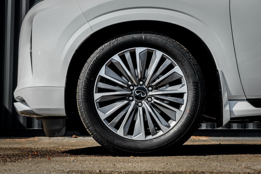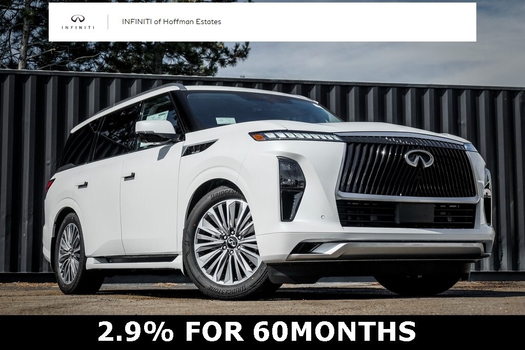 Our Family, serving your Family the ultimate automotive experience. We are conveniently located at 1075 W Golf Road in Hoffman Estates, IL. You can also reach INFINITI of Hoffman Estates any time by filling out our contact form or calling us. The entire staff at INFINITI of Hoffman Estates looks forward to serving you! Online price does not include sales tax, title, doc, or registration. Please call for availability. The vehicle may show on the website and not be in stock . 224-653-2901. Cargo Package (Cargo Blocks/Stabilizers, Cargo Net, Carpeted Cargo Area Protector, Console Net, and Soft-Sided Cargo Cooler), 14 Speakers, 3rd row seats: bench, 4-Wheel Disc Brakes, ABS brakes, Adaptive suspension, Air Conditioning, Alloy wheels, AM/FM radio: SiriusXM with 360L, Anti-whiplash front head restraints, Apple CarPlay/Android Auto, Audio memory, Auto High-beam Headlights, Auto tilt-away steering wheel, Auto-dimming door mirrors, Auto-dimming Rear-View mirror, Auto-leveling suspension, Automatic temperature control, Brake assist, Bumpers: body-color, Compass, Delay-off headlights, Driver door bin, Driver vanity mirror, Dual front impact airbags, Dual front side impact airbags, Electronic Stability Control, Emergency communication system: INFINITI InTouch, Four wheel independent suspension, Front anti-roll bar, Front Bucket Seats, Front Center Armrest, Front dual zone A/C, Front reading lights, Fully automatic headlights, Garage door transmitter: myQ Connected Garage, Heads-Up Display, Heated & Climate Controlled Front Bucket Seats, Heated door mirrors, Heated front seats, Heated rear seats, Heated steering wheel, HVAC memory, Illuminated entry, INFINITI Radiant Illuminated Silver Kick Plates, Knee airbag, Leather Seating Surfaces, Leather steering wheel, Low tire pressure warning, Memory seat, Navigation system: Google Built-in, Occupant sensing airbag, Outside temperature display, Overhead airbag, Overhead console, Panic alarm, Passenger door bin, Passenger vanity mirror, Power door mirrors, Power driver seat, Power Liftgate, Power moonroof, Power passenger seat, Power steering, Power windows, Radio data system, Radio: Klipsch Premium Audio System, Rain sensing wipers, Rear air conditioning, Rear anti-roll bar, Rear reading lights, Rear seat center armrest, Rear window defroster, Rear window wiper, Reclining 3rd row seat, Remote keyless entry, Security system, Speed control, Speed-sensing steering, Splash Guards, Split folding rear seat, Spoiler, Steering wheel memory, Steering wheel mounted audio controls, Super Premium Paint, Tachometer, Telescoping steering wheel, Tilt steering wheel, Traction control, Trip computer, Turn signal indicator mirrors, Variably intermittent wipers, Ventilated front seats, Ventilated rear seats, and Wheels: 22" x 8.5J Cast Aluminum Alloy.