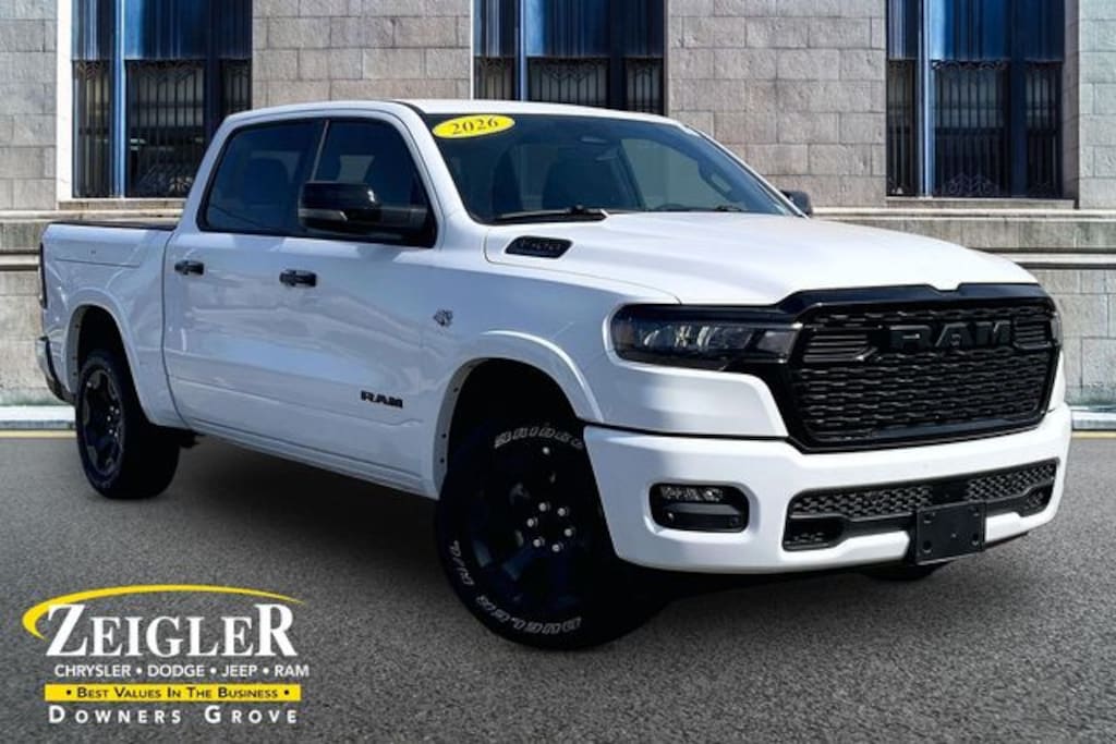 2026 Ram 1500 Big Horn/Lone Star 4WD 8-Speed Automatic HEMI 5.7L V8 Multi Displacement VVT eTorque Bright White Clearcoat 115V Auxiliary Power Outlet, 115V Auxiliary Rear Power Outlet, 12" Touchscreen Display, 2nd Row in Floor Storage Bins, 3 Rear Seat Head Restraints, 4 Way Front Headrests, 400W Inverter, 4G LTE Wi-Fi Hot Spot, 9 Amplified Speakers with Subwoofer, Accent Color Door Handles, Accent Color Premium Power Mirrors, Accent Color Tailgate Handle, Air Conditioning ATC with Dual Zone Control, Anti-Spin Differential Rear Axle, Apple CarPlay, Auto Power-Folding Mirrors, Auto-Dimming Exterior Driver Mirror, Auto-Dimming Rear-View Mirror, Big Horn Level 2 Equipment Group, Black Exterior Mirrors, Black Exterior Truck Badging, Black Headlamp Bezels, Black Interior Accents, Black Painted Exterior Mirrors Caps, Black Premium Power Mirrors, Black Tail Lamp Bezels, Body Color Fender Flares, Body Color Front Bumper, Body Color Rear Bumper with Step Pads, Bucket Seats, Center Console Parts Module, Cluster 7.0" TFT Color Display, Configurable Drive Mode, Connected Travel and Traffic Services, Connectivity - US/Canada, Convex Wide-Angle Exterior Mirror Insert, Deluxe Cloth Bucket Seats, Disassociated Touchscreen Display, Dual Exhaust with Black Tips, Exterior Mirrors Courtesy Lamps, Exterior Mirrors with Heating Element, Exterior Mirrors with Supplemental Signals, Front Seat Back Map Pockets, Full Length Floor Console, Global Telematics Box Module, Glove Box Lamp, Google Android Auto, GPS Antenna Input, GPS Navigation, Grille Black Surround Black Mesh, HD Radio, Heated Front Seats, Heated Steering Wheel, Integrated Center Stack Radio, Integrated Voice Command with Bluetooth, Leather Wrapped Steering Wheel, LED Dome Lamp with on/Off Switch, LED Footwell Lighting, Manual Adjust 4-Way Front Passenger Seat, Media Hub with 2 Charge Only USBs, Night Edition, Overhead LED Lamps, Power 2-Way Driver Lumbar Adjust, Power Adjust 8-Way Driver Seat, Power Adjustable Pedals, Premium Overhead Console, Quick Order Package 27Z Big Horn, Radio: Uconnect 5 Navigation with 12.0" Display, RAM Grille Badge - Black, Rear 60/40 Folding Seat, Rear Center Armrest, Rear Power Sliding Window, Rear Window Defroster, Remote Tailgate Release, Security Alarm, SiriusXM Radio Service, SiriusXM with 360L, Steering Wheel Mounted Audio Controls, Sun Visors with Illuminated Vanity Mirrors, Universal Garage Door Opener, USB Host Flip, Wheels: 20" x 9.0" Aluminum Painted Clad, Wheels: 20" x 9" Aluminum Chrome Clad. Call our Sales department now! 630-241-5500 . Special financing is available in lieu of rebates. Price is good on in stock units and expires at the end of the month or when current incentives change. Zeigler price does not include tax, title, or license. Dealer is not responsible for pricing errors. Images may be stock factory photos and colors may vary. Please contact our sales department for more information.To View Details Click Window Sticker! Price includes: $1000 - 2026 Midwest BC Regional Retail Bonus Cash. Exp. 04/30/2026 $3500 - 2026 National Retail Bonus Cash . Exp. 04/30/2026
