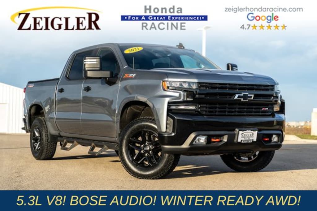 2021 Satin Steel Metallic Chevrolet Silverado 1500 LT Trail Boss âFOR A GREAT EXPERIENCEâ visit Zeigler Honda of Racine, because we take pride in treating our customers like family, ensuring that your experience is one that you will never forget. We have 4.7 Google Rating! Making our store the highest rated Honda dealer in the state of Wisconsin! Every vehicle has been through a multi-point safety inspection and professionally cleaned and disinfected for your p