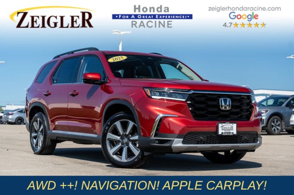 2025 Radiant Red Metallic II Honda Pilot Touring âFOR A GREAT EXPERIENCEâ visit Zeigler Honda of Racine, because we take pride in treating our customers like family, ensuring that your experience is one that you will never forget. We have 4.7 Google Rating! Making our store the highest rated Honda dealer in the state of Wisconsin! Every vehicle has been through a multi-point safety inspection and professionally cleaned and disinfected for your protection. With a convenient location off of I-94 at exit 333; we are proud to serve customers in Racine, Sturtevant, Caledonia, Mount Pleasant, Union Grove, Burlington, Kenosha, Bristol, Waukesha, Milwaukee, Oak Creek and many other surrounding areas! Our Sales Consultants are Factory Certified and have earned some of the highest customer satisfaction ratings in Southeast Wisconsin. We specialize in New Honda, Certified Pre-Owned Honda, as well as many other makes and models that fit all budgets and prices. We offer affordable purchase and leasing options. If you are traveling from Waukegan, Gurnee, Naperville, Pleasant Prairie, Antioch, Fox Lake, or even Madison, feel free to browse our entire inventory of new or pre-owned vehicles right from your home: zeiglerhondaracine.com. Even if we don't have the exact vehicle in our inventory, we will gladly bring one in for you and still guarantee the lowest price possible. A little further than a hop, skip or a jump? We can arrange shipping & delivery! Price may exclude certification, added accessories and/or packages, certain taxes, $399 doc fee, charges and/or fees. Dealer is not responsible for pricing erro
