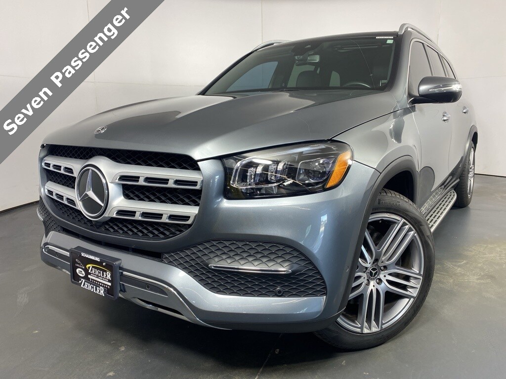 Available at Jaguar Land Rover Schaumburg is a remarkable pre-owned 2021 Mercedes-Benz GLS 450 with 33,140 miles on the odometer. This luxury SUV makes a strong first impression with its sophisticated Selenite Gray exterior, a color that beautifully accentuates its sculpted body lines and commanding presence. Inside, the spacious and refined cabin is appointed with premium Black Leather, creating a serene and elegant environment for all occupants. This GLS 450, often referred to as the "S-Class of SUVs," combines timeless Mercedes-Benz design with a high level of comfort and advanced features.