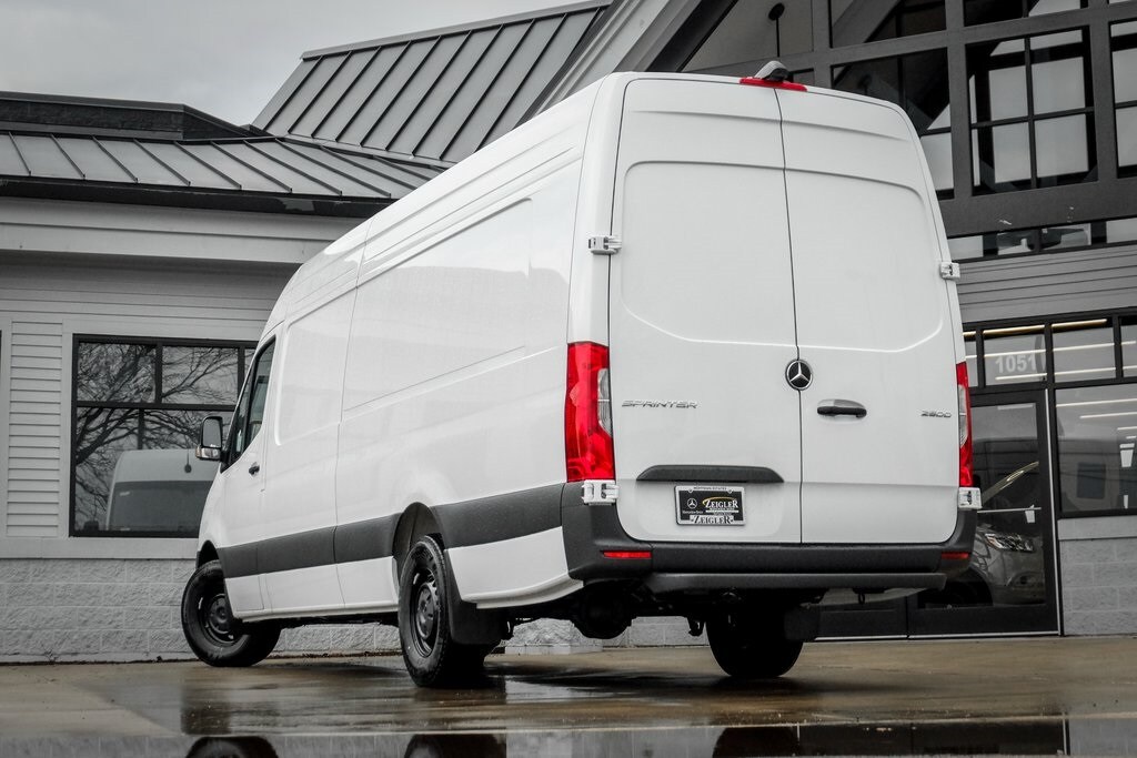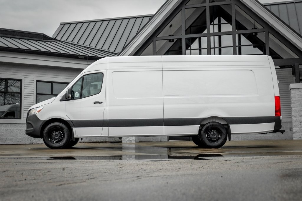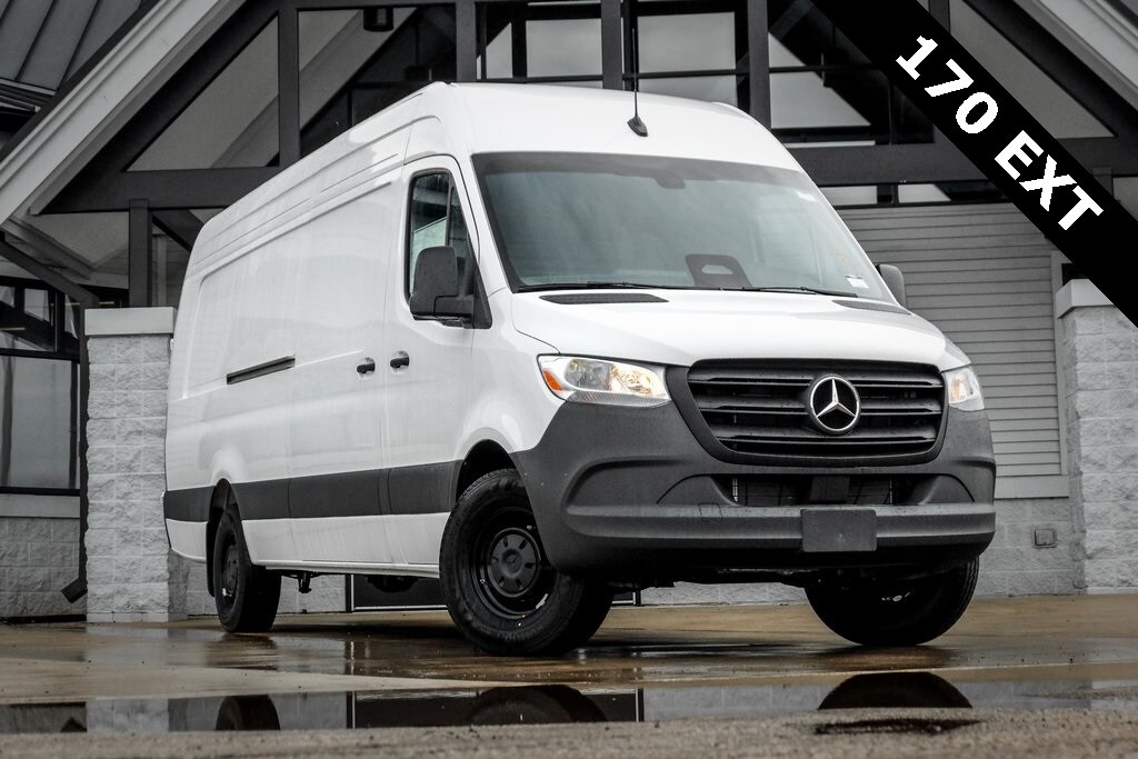 Arctic White 2025 Mercedes-Benz Sprinter 2500 Cargo 170 WB Extended RWD 9-Speed Automatic HO Cargo partition, Electrically folding exterior mirrors, Hinged lid for storage compartment, Rear view camera (head unit display), Blind Spot Assist, Sideguard Assist, Rims painted jet black, Door-mounted assist handles, driver & passenger, Bumper step, rear, grey, Active Brake Assist, Acoustic Package, Co-Driver Comfort Head Restraint, Co-Driver's Seat Lumbar Support, Comfort Driver's Seat, Comfort Overhead Control Panel, Comfort Package, Comfort Package w/Seat Addition, Comfort Passenger's Seat, Driver Comfort Head Restraint, Driver's Seat Lumbar Support, Instrument Panel Front-to-Rear Outlet, MBUX Package, Pre-Installation for Navigation, Radio: MBUX Multimedia System w/10.25" Touchscreen, Smartphone Integration Package.