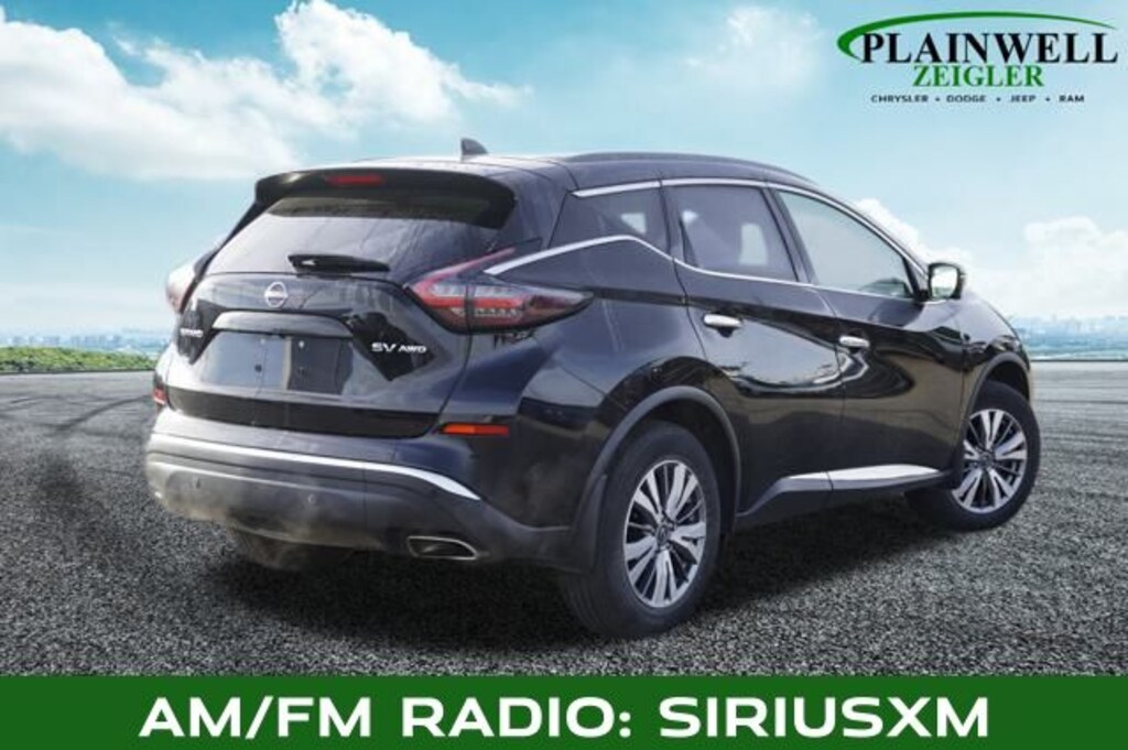 Super Black 2023 Nissan Murano SV AWD CVT with Xtronic 3.5L V6 DOHC 24V CVT with Xtronic, AWD, 6 Speakers, AM/FM radio: SiriusXM, Auto High-beam Headlights, Auto-dimming Rear-View mirror, Blind Spot Warning, Brake assist, Bumpers: body-color, CD player, Delay-off headlights, Electronic Stability Control, Front Bucket Seats, Front Center Armrest, Heated door mirrors, Heated Front Bucket Seats, Heated front seats, Leatherette-Appointed Seat Trim, NissanConnect featuring Apple CarPlay and Android Auto, Panic alarm, Power door mirrors, Power driver seat, Power passenger seat, Power steering, Power windows, Radio data system, Rear window wiper, Remote keyless entry, Security system, Speed control, Speed-Sensitive Wipers, Split folding rear seat, Spoiler, Turn signal indicator mirrors, Variably intermittent wipers, Wheels: 18" Machined Aluminum-Alloy.
