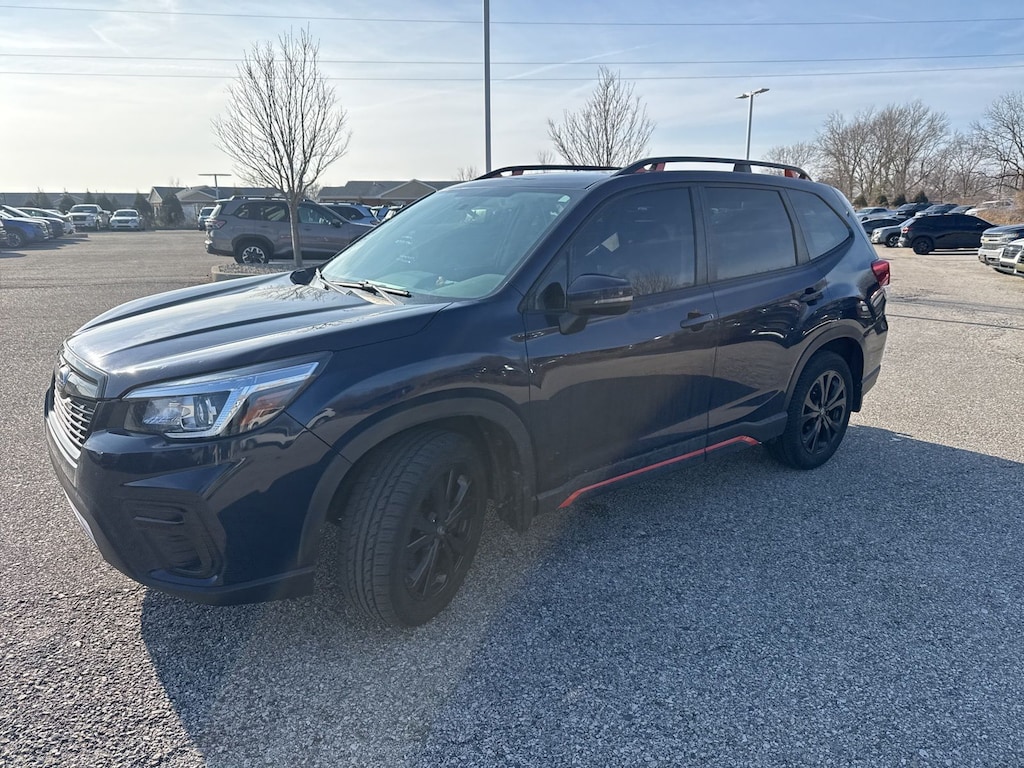 Recent Arrival! 2020 Subaru Dark Blue Pearl AWD Forester Sport Lineartronic CVT 3.70 Axle Ratio, 4-Wheel Disc Brakes, 6 Speakers, ABS brakes, Air Conditioning, Alloy wheels, AM/FM radio: SiriusXM, Auto High-beam Headlights, Automatic temperature control, Brake assist, Bumpers: body-color, CD player, Driver door bin, Driver vanity mirror, Dual front impact airbags, Dual front side impact airbags, Electronic Stability Control, Emergency communication system: STARLINK Safety and Security (Subscription Required), Exterior Parking Camera Rear, Four wheel independent suspension, Front anti-roll bar, Front Bucket Seats, Front Center Armrest, Front fog lights, Front reading lights, Fully automatic headlights, Heated door mirrors, Heated Front Bucket Seats, Heated front seats, Illuminated entry, Knee airbag, Leather Shift Knob, Low tire pressure warning, Occupant sensing airbag, Outside temperature display, Overhead airbag, Overhead console, Paddle-Shift Control Switches, Panic alarm, Passenger door bin, Passenger vanity mirror, Power door mirrors, Power driver seat, Power moonroof: Panoramic, Power steering, Power windows, Radio data system, Radio: Subaru Starlink 6.5" Multimedia Plus System, Rear anti-roll bar, Rear seat center armrest, Rear window defroster, Rear window wiper, Remote keyless entry, Roof rack: rails only, Security system, Speed control, Speed-sensing steering, Split folding rear seat, Spoiler, Sport Cloth Upholstery, STARLINK/Apple CarPlay/Android Auto, Steering wheel mounted audio controls, Tachometer, Telescoping steering wheel, Tilt steering wheel, Traction control, Trip computer, Turn signal indicator mirrors, Variably intermittent wipers, and Wheels: 18" x 7.0J Black Finish Aluminum Alloy.