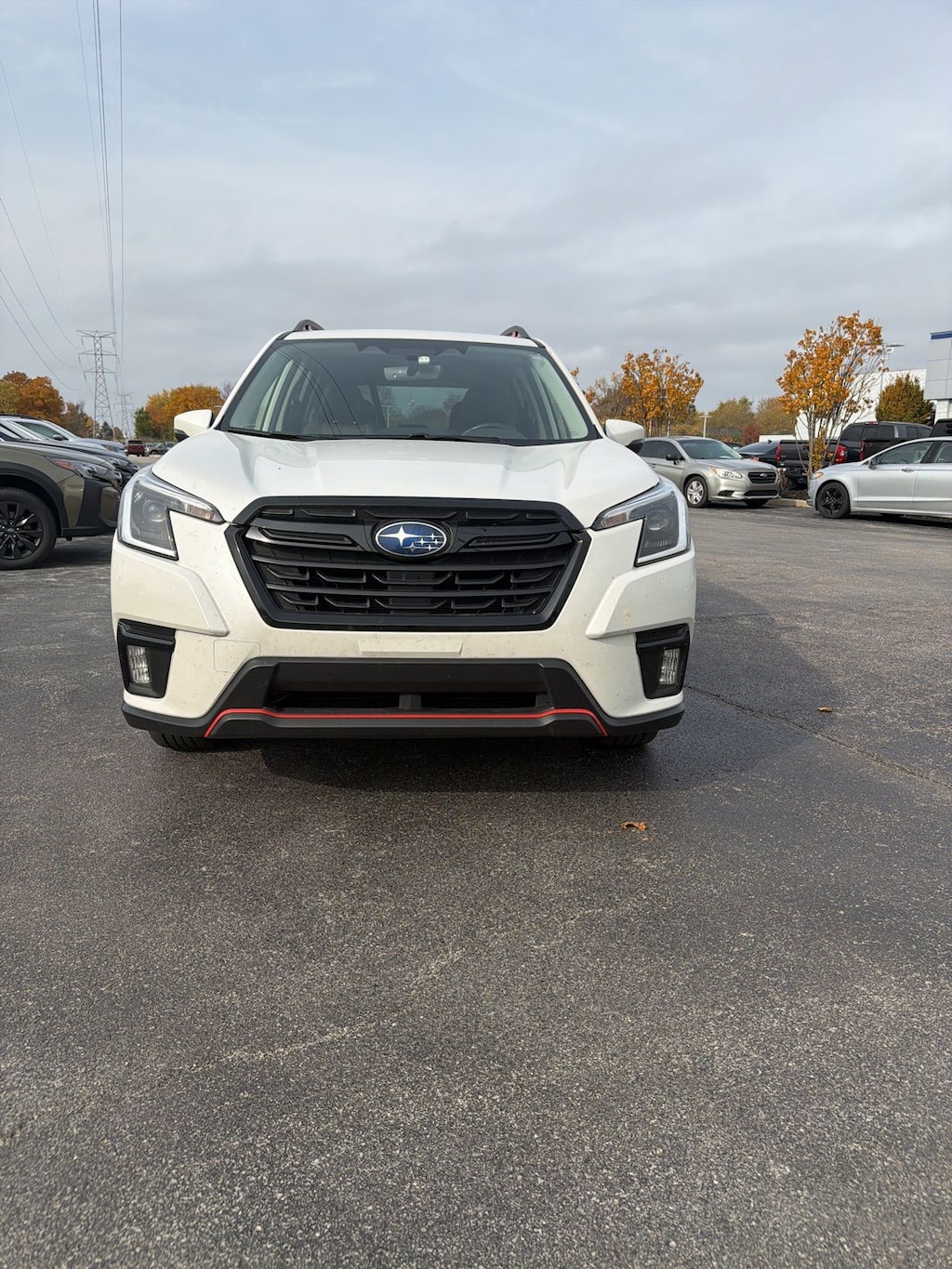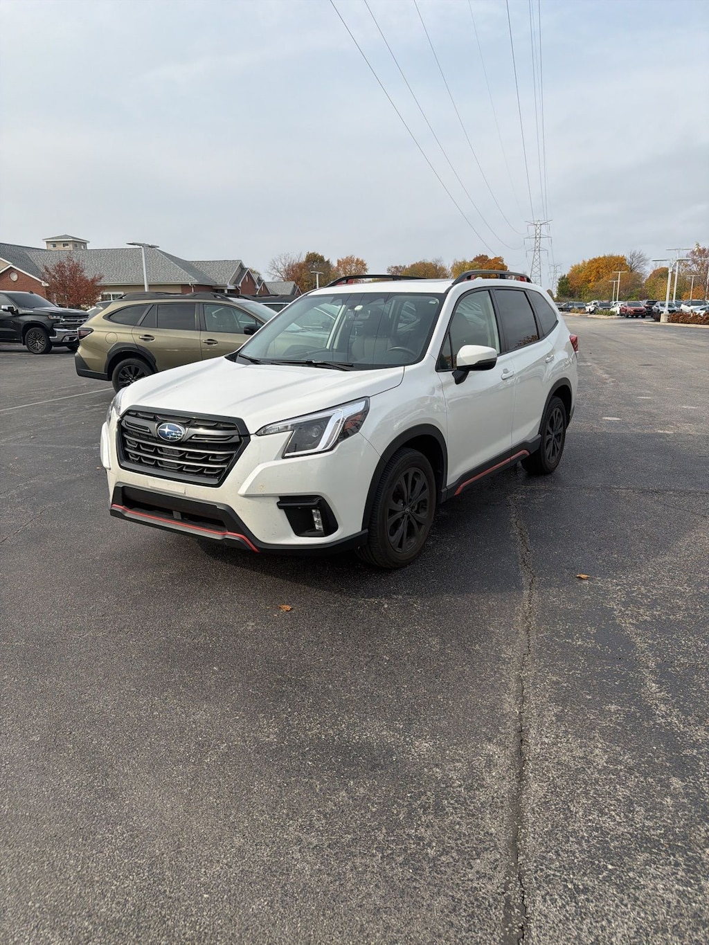Recent Arrival! 2023 Subaru Certified. White AWD Forester Sport Lineartronic CVT 3.70 Axle Ratio, 4-Wheel Disc Brakes, 6 Speakers, ABS brakes, Air Conditioning, Alloy wheels, AM/FM radio: SiriusXM, Anti-whiplash front head restraints, Auto High-beam Headlights, Automatic temperature control, Brake assist, Bumpers: body-color, CD player, Driver door bin, Driver vanity mirror, Dual front impact airbags, Dual front side impact airbags, Electronic Stability Control, Emergency communication system: STARLINK Safety and Security (Subscription Required), Exterior Parking Camera Rear, Four wheel independent suspension, Front anti-roll bar, Front Bucket Seats, Front Center Armrest, Front fog lights, Front reading lights, Fully automatic headlights, Heated door mirrors, Heated Front Bucket Seats, Heated front seats, Illuminated entry, Knee airbag, Leather Shift Knob, Low tire pressure warning, Occupant sensing airbag, Outside temperature display, Overhead airbag, Overhead console, Panic alarm, Passenger door bin, Passenger vanity mirror, Power door mirrors, Power driver seat, Power moonroof: Panoramic, Power steering, Power windows, Radio data system, Radio: Subaru Starlink 6.5" Multimedia Plus System, Rear anti-roll bar, Rear seat center armrest, Rear window defroster, Rear window wiper, Remote keyless entry, Roof rack: rails only, Security system, Speed control, Speed-sensing steering, Split folding rear seat, Spoiler, Sport Cloth Upholstery, STARLINK/Apple CarPlay/Android Auto, Steering wheel mounted audio controls, Tachometer, Telescoping steering wheel, Tilt steering wheel, Traction control, Trip computer, Turn signal indicator mirrors, Variably intermittent wipers, and Wheels: 18" x 7.0 J Black Finish Aluminum-Alloy.