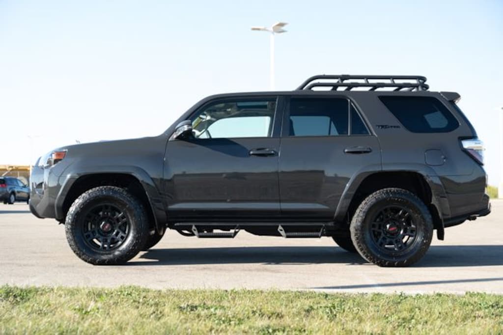 4WD, APPLE CARPLAY, ANDROID AUTO, BLIND SPOT MONITOR, LANE DEPARTURE WARNING, SUNROOF, PARKING SENSORS, HEATED STEERING WHEEL, HEATED SEATS, ROOF RAILS, BACKUP CAMERA, KEYLESS ENTRY, BLUETOOTH, JBL PREMIUM AUDIO, 15 Speakers, 3.727 Axle Ratio, 4-Wheel Disc Brakes, ABS brakes, Air Conditioning, AM/FM radio: SiriusXM, Anti-whiplash front head restraints, Apple CarPlay/Android Auto, Auto High-beam Headlights, Auto-dimming Rear-View mirror, Automatic temperature control, Black Lug Nuts, Brake assist, Bumpers: body-color, Compass, Driver door bin, Driver vanity mirror, Dual front impact airbags, Dual front side impact airbags, Dual Zone Auto Climate Control, Electronic Stability Control, Emergency communication system: Safety Connect (1-year trial), Exterior Parking Camera Rear, Fog Lights, Fox Shocks, Front anti-roll bar, Front Bucket Seats, Front Center Armrest, Front dual zone A/C, Front fog lights, Front reading lights, Garage Door Opener, Garage door transmitter: HomeLink, Heated door mirrors, Heated Front Bucket Seats, Heated Outside Rear-View Mirrors, Heated steering wheel, Illuminated entry, Leather Shift Knob, Moonroof w/Tilt Up & Slide, Multi-Terrain Back Monitor, Navigation System, Outside temperature display, Overhead console, Panic alarm, Passenger door bin, Passenger vanity mirror, Power door mirrors, Power driver seat, Power passenger seat, Power steering, Power windows, Radio: Premium Audio w/JBL, Rear seat center armrest, Rear window defroster, Rear window wiper, Remote keyless entry, Roof rack, Roof Rack, Security system, SofTex Seat Trim, Speed control, Speed-sensing steering, Split folding rear seat, Spoiler, Steering wheel mounted audio controls, Tachometer, Telescoping steering wheel, Tilt steering wheel, Traction control, TRD Pro All Weather Floor Liner, TRD Pro Badging, TRD Pro Exhaust, TRD Pro Package, TRD Shift Knob, Variably intermittent wipers, Wheel Locks, Wheels: 17" Matte Black Flow-Formed TRD Alloy.