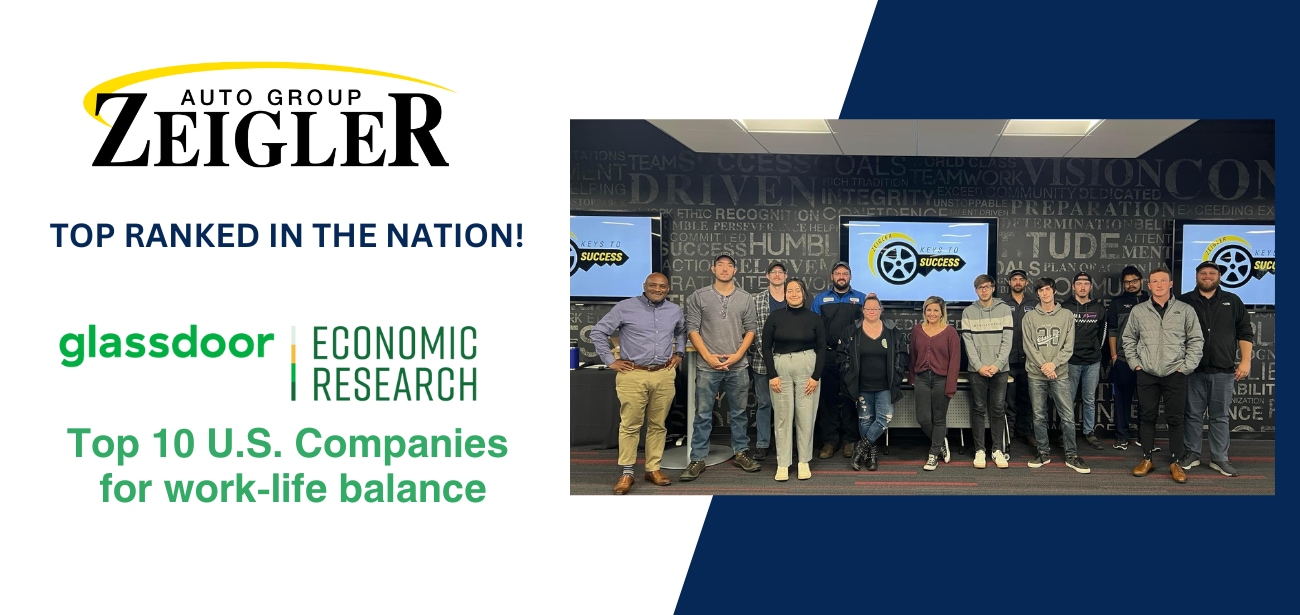 A Glassdoor Economic Research study on Work-Life Balance in the U.S. for 2022 has named Zeigler Auto Group among its Top 10 U.S. companies for work-life balance. The study gathered Glassdoor.com reviews from January through September 2022 using companies with 1,000 or more employees. Zeigler ranked at number 6 overall with an impressive 4.77 average rating. The dealer group was also the only automotive company to make the list.