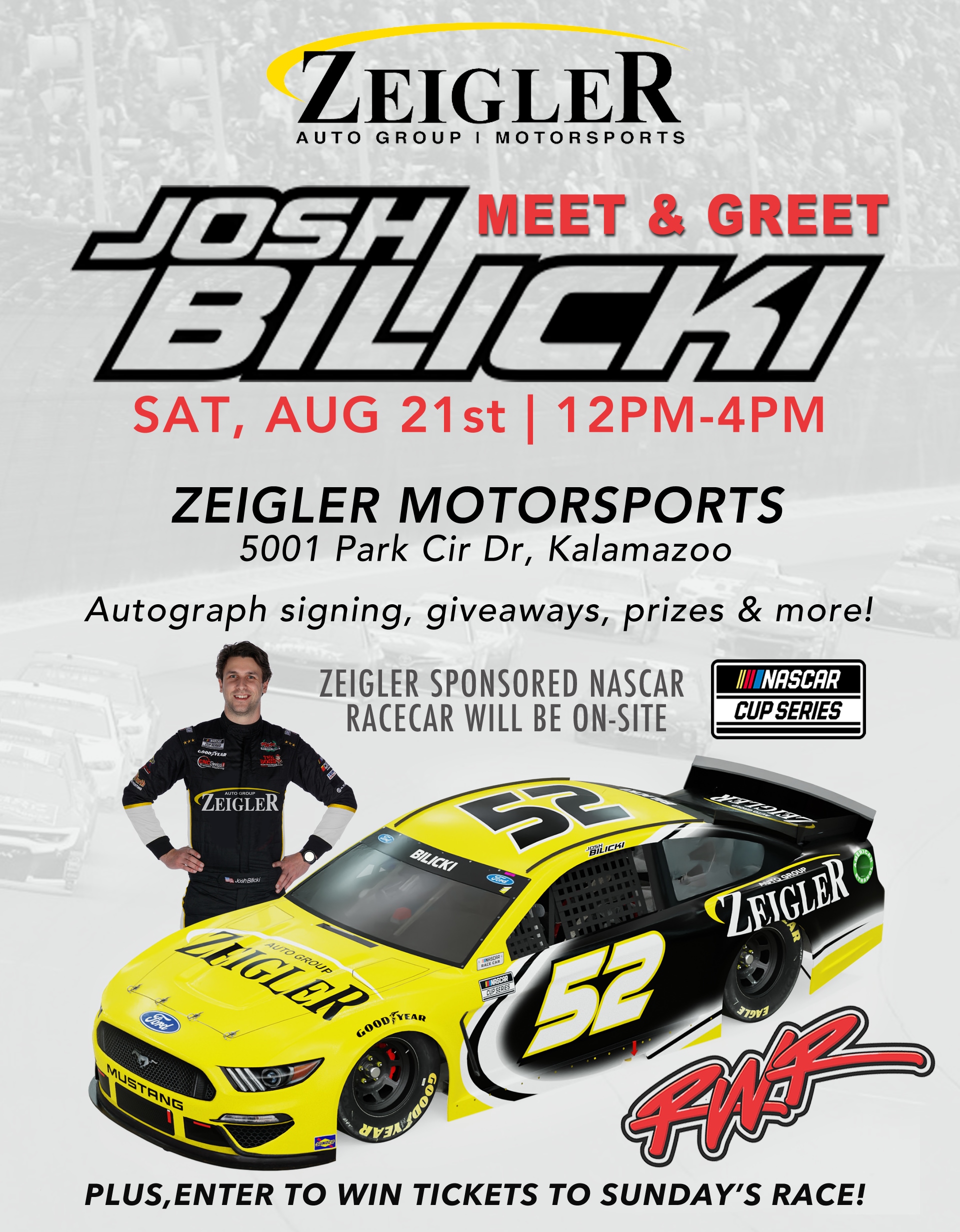 KALAMAZOO (August 16, 2021) - Zeigler Auto Group will be sponsoring Josh Bilicki - of Rick Ware Racing (RWR) - for the Firekeepers Casino 400 of the NASCAR Cup Series on Sunday, August 22 at 3:00 p.m. EST at Michigan International Speedway (MIS).