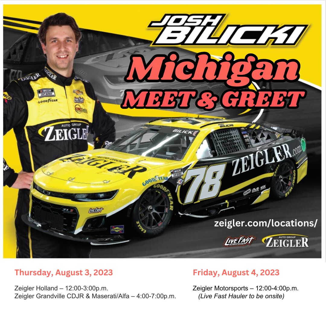 Zeigler Auto Group today announced that its No. 78 Camaro, driven by Josh Bilicki, will be back at Michigan International Speedway for the FireKeepers Casino 400 on Sunday, August 6, 2023 at 2:30p.m. Zeigler will also be hosting free Meet & Greets for Bilicki at three of its Michigan locations. The first stop will be at its newly acquired Zeigler Holland complex on Thursday, August 3 from noon to 3:00 p.m.; and Zeigler CDJR from 4:00 p.m. to 7:00 p.m. The Friday Meet & Greet will take place at Zeigler Motorsports from noon to 4:00 p.m. and will feature the Live Fast Motorsports No. 78 hauler.